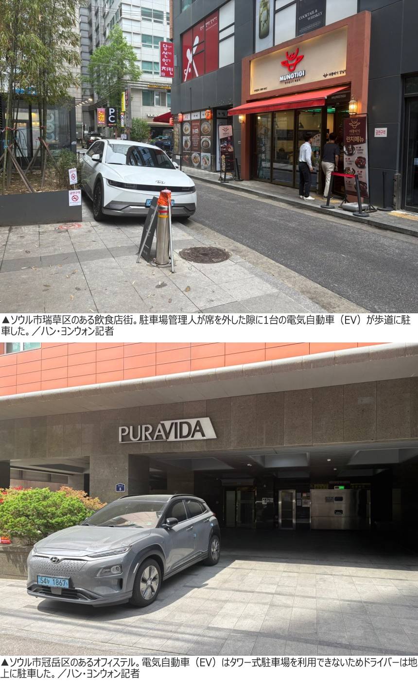 「おいおい、EVは駄目だ。駄目!」26日午後3時、ソウル市瑞草区のある商業ビル駐車場に1台のテスラが入ろうとすると、駐車場管理人の70歳男性が大声で叫んだ。窓から顔を出したドライバーは残念そうな顔でUターンして立ち去った。このドライバーは10分ほど周囲の駐車場を探したが、結局駐車できず他へ行ってしまった。