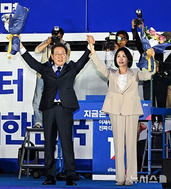 【NEWSIS】4日午前、ソウル・汝矣島の国会前で行われた国民開票放送イベントで、市民に手を振る李在明(イ・ジェミョン)大統領と金恵京(キム・ヘギョン)夫人。写真=共同取材団