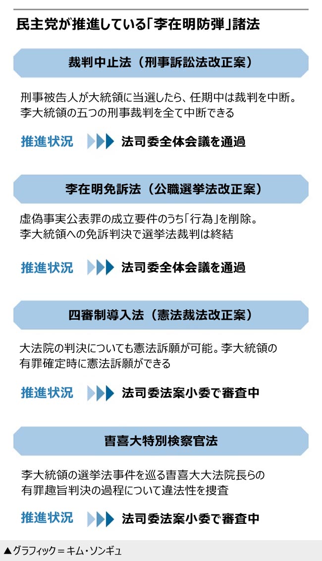 4日に国会法制司法委員会の法案小委を通過した「大法官(最高裁裁判官に相当)増員法案」だけでなく、進歩(革新)系の与党「共に民主党」が推進する刑事訴訟法・公職選挙法・憲法裁判所法の改正案と、曺喜大(チョ・ヒデ)大法院長(最高裁長官に相当)に対する特別検察官法案も、いわゆる「李在明(イ・ジェミョン)防弾法」と呼ばれる。これらの法案はいずれも、大法院が5月1日に当時の李在明大統領選挙候補の公職選挙法違..