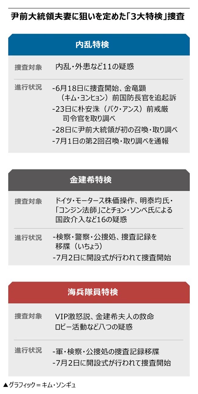 金建希特検・海兵隊員特検も7月2日にそれぞれ開設式を開き、尹前大統領夫妻を対象に捜査を開始する。金建希特検チームは「ドイツ・モータース株価操作」「政治ブローカー、明泰均 (ミョン・テギュン)氏による党公認候補介入疑惑や、「コンジン法師」ことチョン・ソンベ氏による国政介入疑惑など、金建希夫人を巡る16の疑惑を捜査する。海兵特検チームは、尹前大統領が海兵隊捜査団のチェ上等兵殉職事件の捜査で外圧を行使したのか、金建希夫人らを通じた救命ロビー活動があったかどうかなど、八つの疑惑を捜査対象としている。