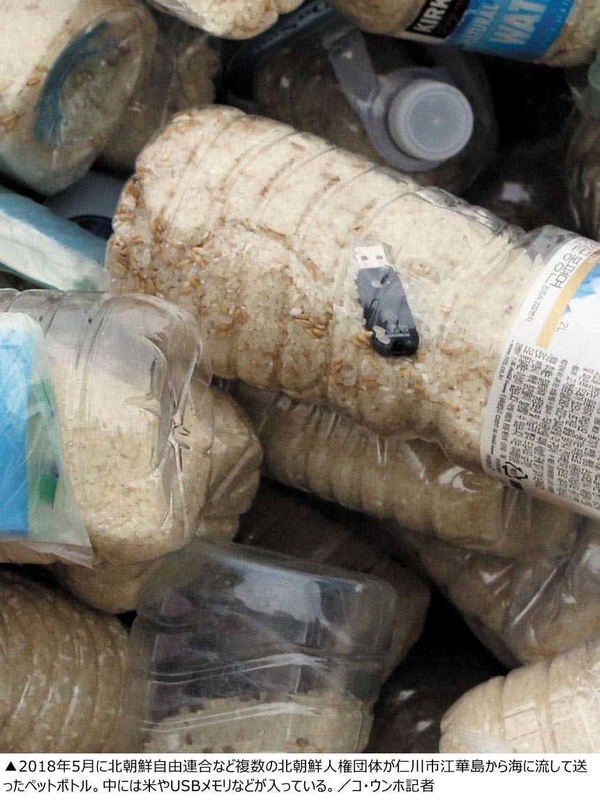 仁川江華警察署は6月27日午前1時6分ごろ、仁川市江華郡下店面望月墩台で20-50代の米国人男性6人を逮捕したと発表した。6人が北朝鮮に1300本のペットボトルを流そうとしたところ、出動した警察官に逮捕された。2リットルサイズのペットボトルの中には米、1ドル紙幣、韓国映画が保存されたUSBメモリー、小さく巻かれた聖書などが入っていた。警察の関係者によると、ペットボトルの中に北朝鮮の体制を批判するビラは入っていなかったという。