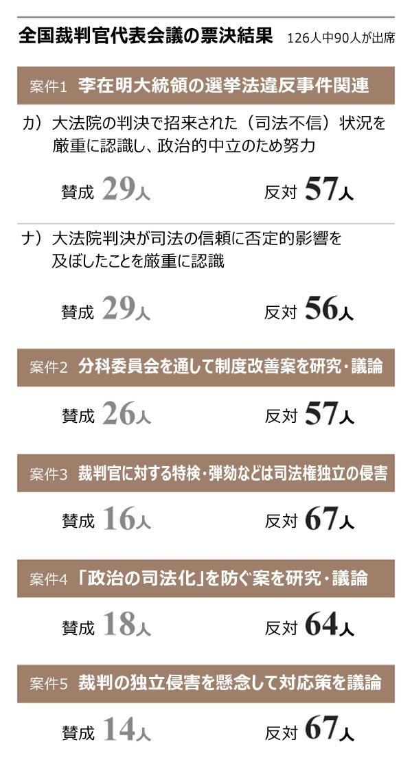 「大法院判決が裁判所の政治的中立性と裁判の手続き的正当性に対する疑念を呼び起こし、司法の信頼に否定的な影響を及ぼしたことについて厳重に認識する」などの内容の案件は、裁判官代表29人賛成、56人反対で否決された。一部の判事たちが「李大統領に対する大法院の裁判や判決は間違っている」として出した案件だが、多数の代表がこれに同意しなかったのだ。