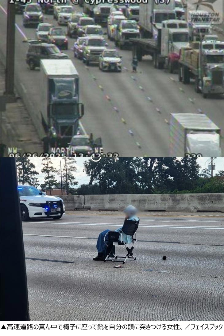 ABCニュースなど海外メディアが6月29日(現地時間)に報じたところによると、騒動は6月26日、米テキサス州ヒューストンの北側を通る高速道路で発生。事件を起こしたのは64歳の女性で、自身の車を運転中に別の車にわざとぶつかり、車から降りると道路の真ん中に携帯用の椅子を広げて座った。さらに、所持していた銃を取り出して自分の頭に突きつけた。
