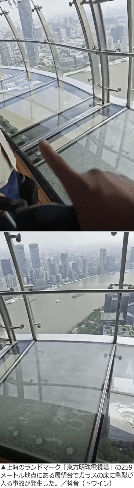 タワン新聞など現地メディアが6月26日、報じた。それによると、事故はSNS(交流サイト)に「上海の東方明珠のガラスに亀裂が入った。天候があまりにもひどい」という書き込みと動画が同日にアップされたことで広く知れ渡った。動画には、東方明珠電視塔の展望台の床で、..