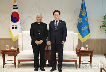 【NEWSIS】李在明(イ・ジェミョン)大統領が7日、ソウル市竜山の大統領室庁舎で兪興植(ユ・フンシク)枢機卿との接見に先立ち、記念撮影をしているところ。