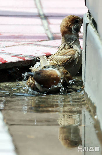 【NEWSIS】釜山地域で猛暑特報が続いている8日、東区のある建物の庭園では、スズメたちが水溜まりに入って涼をとっていた。