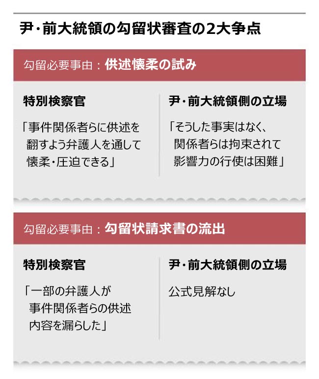 この日の令状審査では、尹・前大統領の「証拠隠滅の恐れ」が争点になった。特検側は「金成勲(キム・ソンフン)警護処次長と姜・前付属室長が警察や検察、特別検察官の取り調べを受けた際、尹・前大統領側の弁護人の立ち会いがあるかどうかで供述内容が違っていた」として、事件関係者らに供述を翻すよう懐柔・圧迫できるので勾留が必要だと強調した。しかし尹・前大統領側は「そんな事実はない」「主な関係者は拘束されており、影響力の行使も難しい」と反論した。