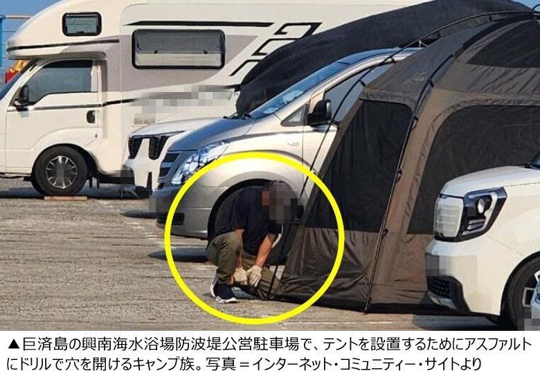 投稿者Aさんは「慶尚南道巨済市の興南海水浴場防波堤で、あるキャンプ族が公営駐車場のアスファルトにドリルでテントを固定する様子」として、5月29日に撮影したと推定される写真を載せた。