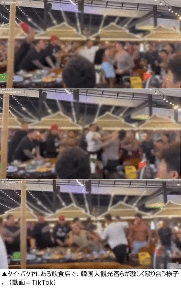 【NEWSIS】タイの観光地パタヤにある飲食店で今月11日、韓国人観光客のグループが仲間同士で激しい殴り合いを始め、店内をめちゃくちゃに荒らす様子がカメラに捉えられて波紋を呼んでいる。