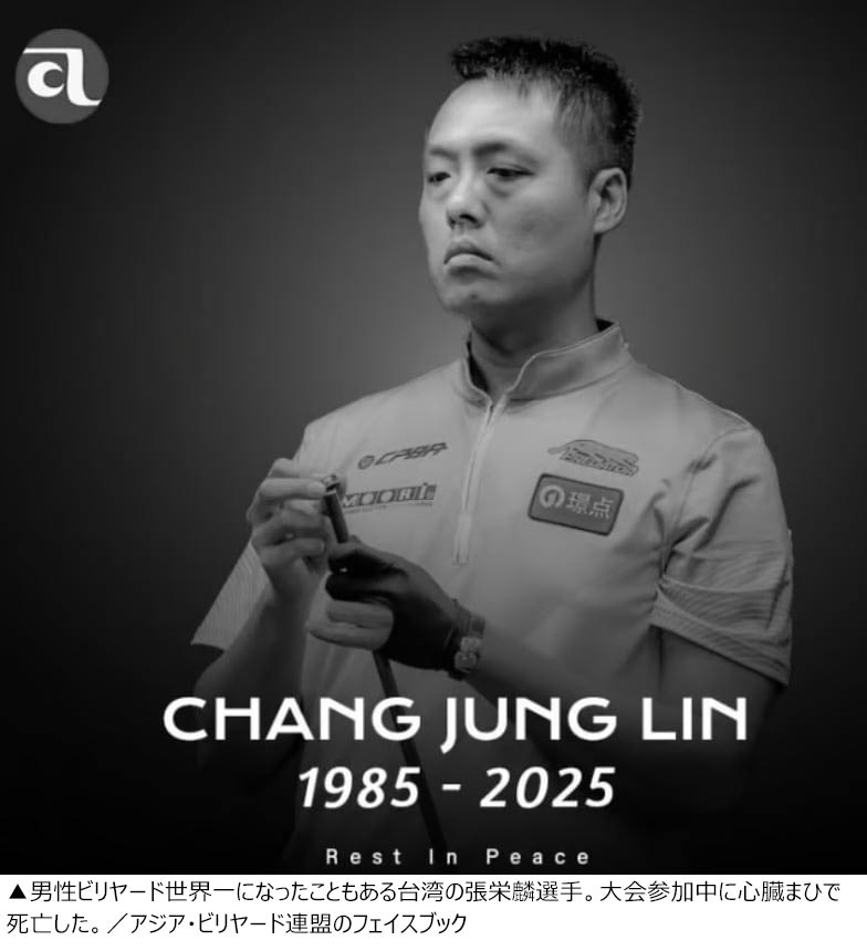男子ビリヤードの世界チャンピオンになったこともある台湾ビリヤード界のトップスター、張栄麟選手が、大会参加中に心臓まひで死亡した。40歳だった。