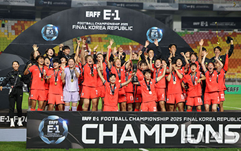 【NEWSIS】16日、京畿道水原市の水原ワールドカップ(W杯)スタジアムで行われたEAFF(東アジアサッカー連盟)E-1サッカー選手権2025女子授賞式で、優勝してトロフィーを贈られ喜ぶ韓国女子代表チームの申相又(シン・サンウ)監督と選手たち。