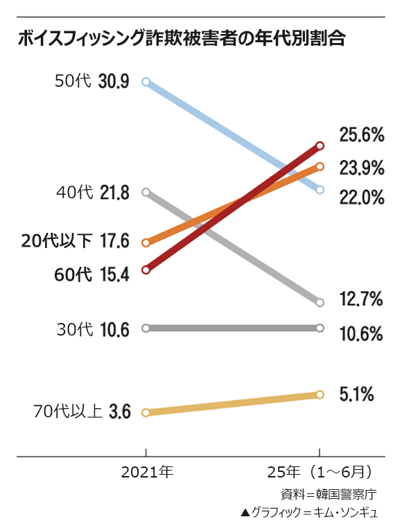 最近は50代の被害者が大幅に減少している。50代が過去に比べてインターネット技術などに親しむようになったためだと分析されている。代わりに60代と20代以下の被害割合が急増している。今年上半期、20代以下のボイスフィッシング詐欺被害者の割合は23.9%で、最も被害が多い年代である60代(25.6%)に続いた。東国大警察行政学科の李潤鎬(イ・ユンホ)教授は「ソーシャルメディアなどデジタル活動が活発な青年層が新たな犯罪ターゲットに浮上している」と話した。