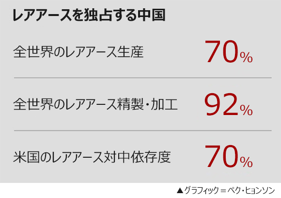 中国の鉱物統制は米国の中国に対する半導体、人工知能(AI)、電池分野でのけん制に対応するカードとみられる。国際エネルギー機関(IEA)によると、中国は世界のレアアース生産の約70%、精製・加工の92%を占めている。米地質調査所(USGS)も2020~23年に米国が輸入したレアアースとその化合物の約70%が中国産だったことを明らかにした。中国は第一次トランプ政権当時の米中貿易戦争ではレアアース規制を前面に掲げることができなかったが、先端技術、サプライチェーン自立で成果を収めた現在は、米国を標的ととする鉱物規制をためらいなく強化していると分析されている。