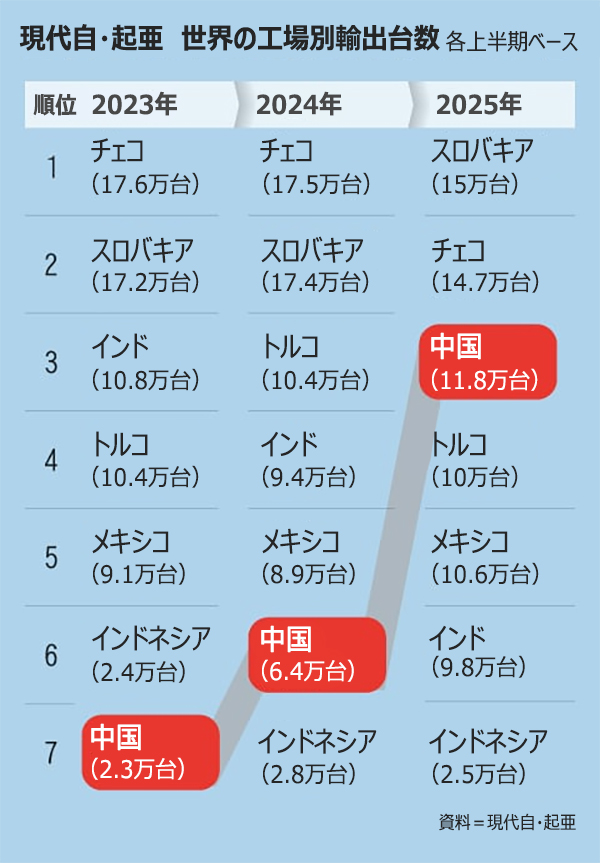 現代自・起亜はこれまでインドネシア、ブラジルなどに工場を設け、輸出拠点として活用してきた。現代自関係者は「海外工場に追加で設備投資を行うには、現地の内需による後押しが必要だが、成長スピードが予測より遅い」と述べた。その上、メキシコ工場は米国の関税障壁によって輸出が事実上阻まれるなど将来的な不透明さも増している。一方、中国は主要国に比べ、依然として人件費が安く、標準化された生産方式が定着したこともあり、輸出拠点としてのメリットが高まっている。
