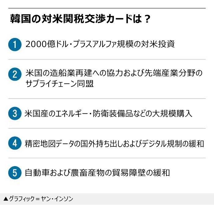 米国が追加関税を発動するとしている8月1日が迫る中、米国は韓国に「日本と同規模の投資および購入」を強く要求していることが30日までに分かった。日本は5500億ドル(約82兆円)規模の投資ファンドを造成し、ボーイング社の航空機100機を購入するほか米国製の防衛装備品の購入予算増額(30億ドル=約4500億円)を約束した。