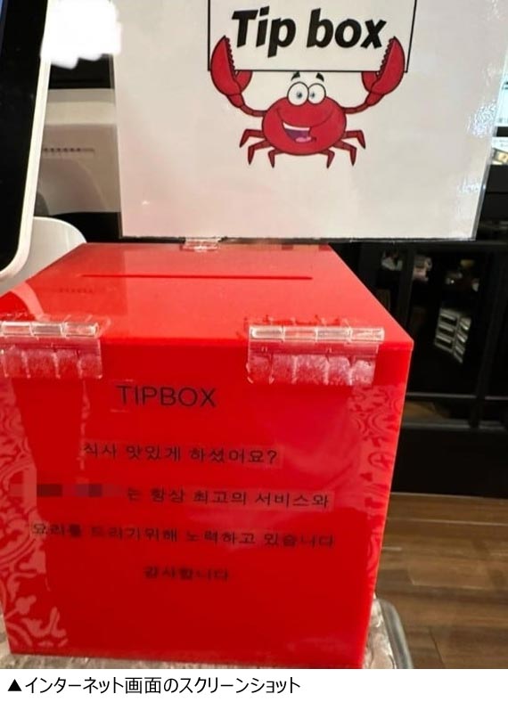 インターネットのコミュニティーサイトには7月28日、「ソウル・汝矣島の飲食店に置かれたチップボックスは不適切だ」という趣旨の投稿が複数アップされた。投稿には「チップボックス」と書かれた赤い箱の写真が添付されていた。この箱には「料理はおいしく召し上がっていただけましたか? 常に最高のサービスと料理を提供するために努力しています。ありがとうございます」と書かれている。