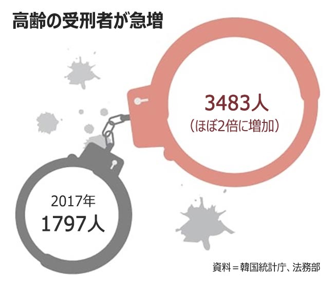 60-70代の高齢者による凶悪犯罪が急激に増えている。韓国法務部(省に相当)が27日に発表したところによると、昨年の時点で65歳以上の受刑者は3483人で、2017年(1797人)の2倍近くまで増加したことが分かった。同じ期間の全受刑者数の増加率(13%)に比べ7倍以上の伸びだ。特に、殺人、性的暴行、暴力行為によって逮捕・起訴された高齢の受刑者が急増している。昨年は、殺人による全受刑者3083人のうち19%が65歳以上の高齢者だった。