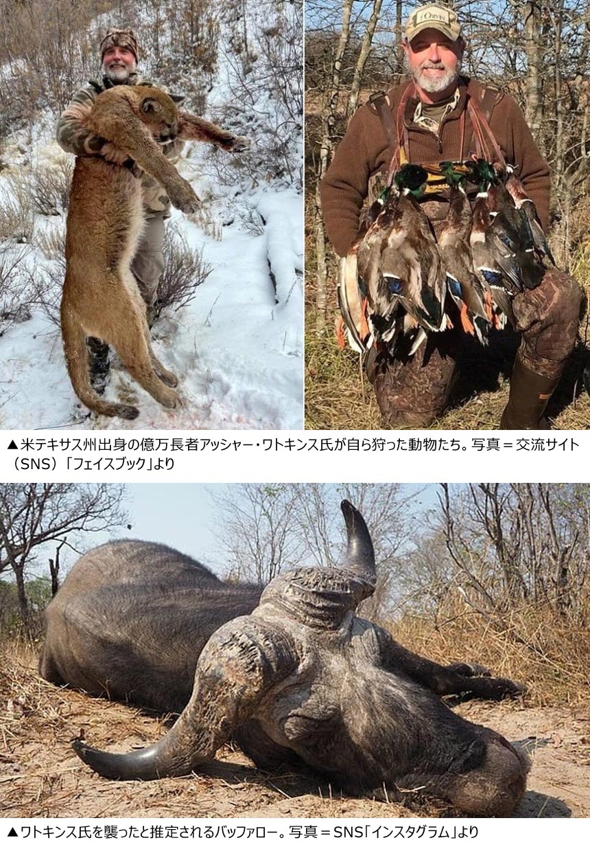 ワトキンス氏は米テキサス州で数百万ドル(数億円)規模の高級牧場不動産を取引するファミリー企業「ワトキンス・ランチ・グループ」のマネージング・パートナーだ。交流サイト(SNS)を通じてピューマ・大型のオスのシカ・数百羽の野鳥など、さまざまな野生動物を狩って記念品(トロフィー)としてその体の一部などを手に入れる「トロフィーハンティング」の写真を公開してきた。