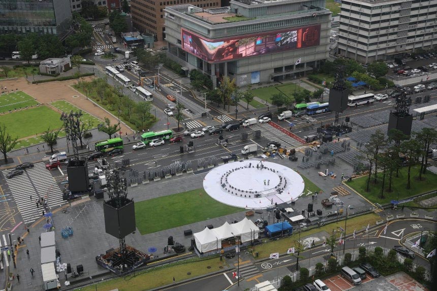 ▲ソウル都心の光化門広場に設置された光復節記念行事のステージ。13日撮影。韓国大統領府は光復節記念行事と同時に執り行われる李在明(イ・ジェミョン)大統領国民任命式に約1万人を招待する予定だ。/news1