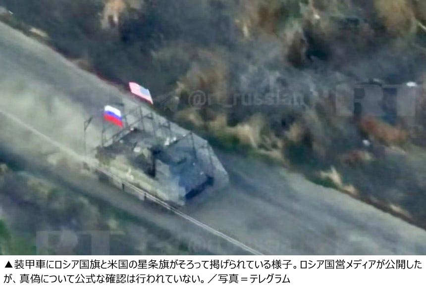 【写真】米ロの国旗を掲げて走行するロシア軍装甲車..