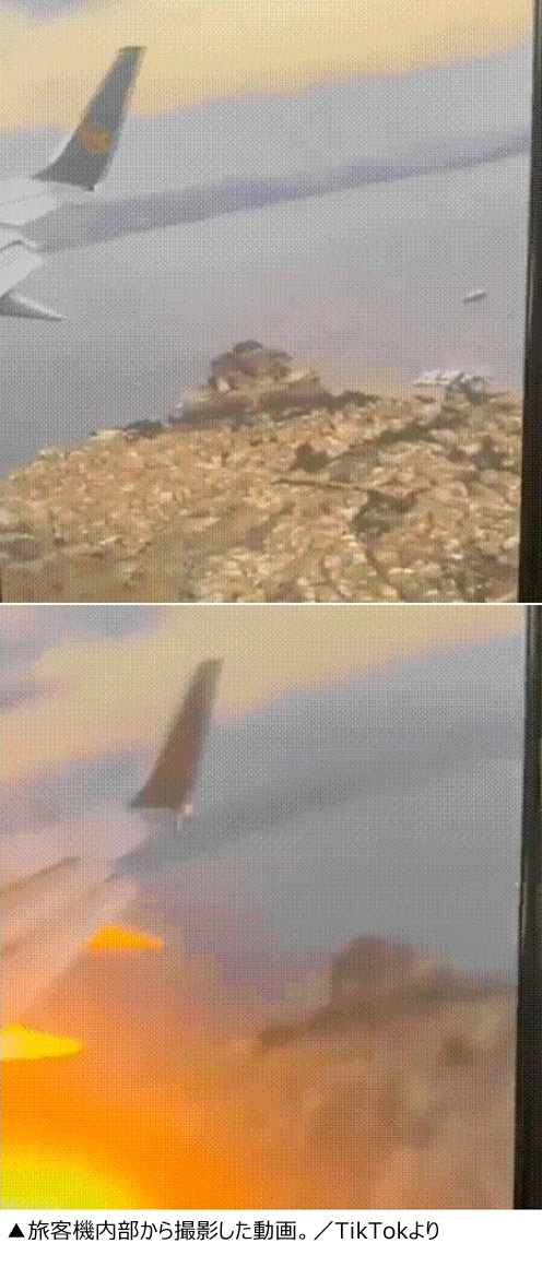 地上から撮影された動画を見ると、旅客機の右翼エンジン付近で爆発音がすると同時に、炎が噴き出している。また、乗客が旅客機の機内で撮影した動画にも、同じ部分から炎が上がる様子が映っている。