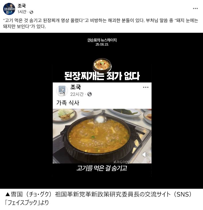 曺国院長は同日、MBCラジオの番組『権純杓(クォン・スンピョ)のニュース・ハイキック』に出演し、「一部で『肉を食べたのを隠してテンジャンチゲ(の動画)を載せた』と言われているが、あまりにもおかしな誹謗(ひぼう)中傷をしていると思う」と語った。