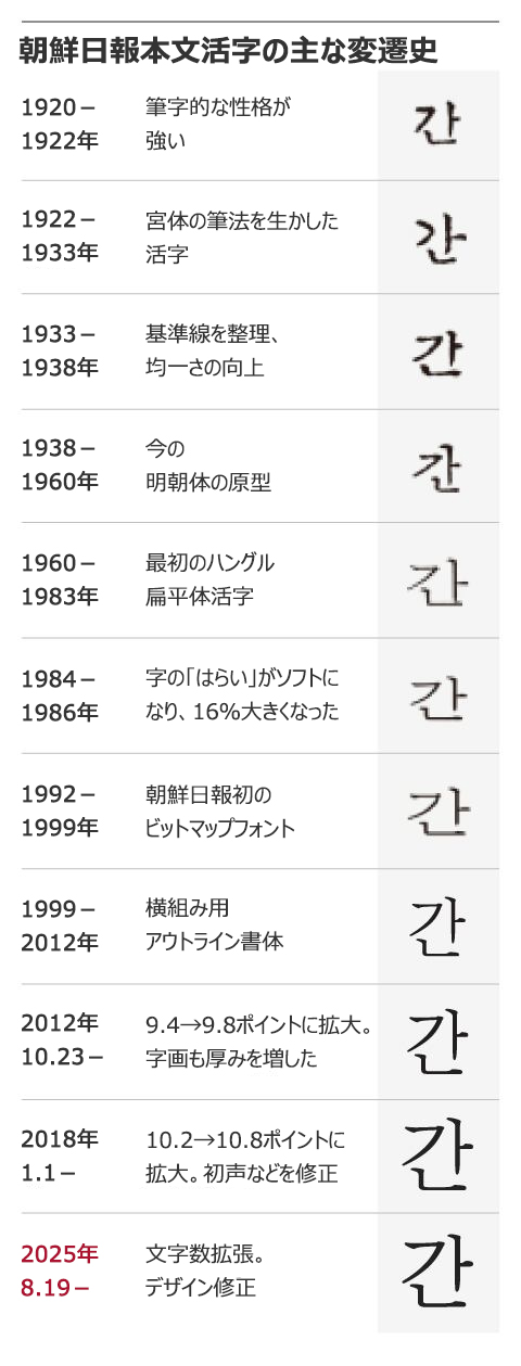 1922年の「宮体」活字開発を皮切りに続いてきた書体改善、今回が21回目です。朝鮮日報は、韓国の新聞社としては唯一、独自開発した固有の書体を保有しており、日帝強占期のハングル抹殺政策の中でも活字開発を止めませんでした。今回の書体は、ハングルの初声(音節の最初の子音)・中声(母音)・終声(音節の終わりの子音)を組み合わせて表現可能な文字の数を、従来の2934字から1万1172字に拡張し、ハングルの全ての文字を完璧に具現できるようになりました。「光復80周年」を迎えて、日帝強占期の抑圧の中でも守り抜いたハングルの全ての表現が可能なように拡張した―という象徴的な意味を盛り込みました。
