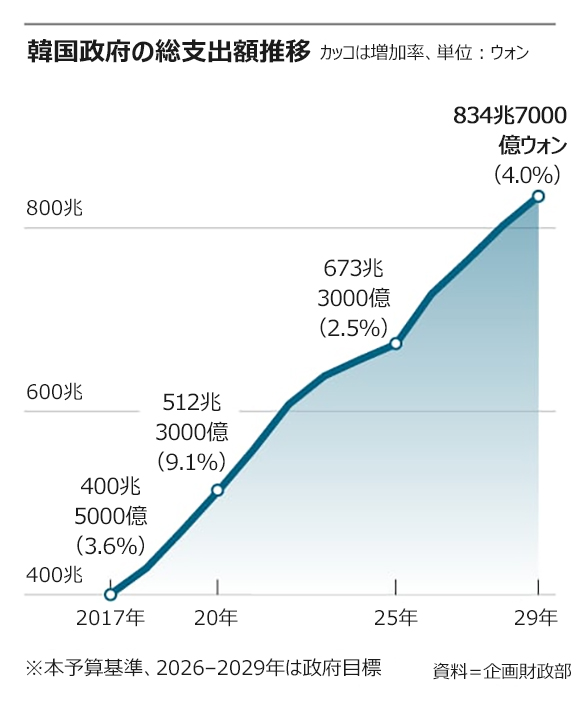 財政赤字は国の借金となるため、その不足分はどこかから持ってこなければならない。来年度の国の債務は今年度よりも113兆ウォン(約12兆円)多い過去最大の1415兆ウォン(約149兆8000億円)、GDPの50%を上回ると見込まれている。AI(人工知能)3強を目指す投資や研究開発予算の拡大など、成長動力を見出すための必要な予算もあるが、李在明(イ・ジェミョン)大統領の選挙公約だった児童手当の拡充や農漁村基本所得支給などバラマキ的な予算も数十兆ウォン(数兆円)含まれている。