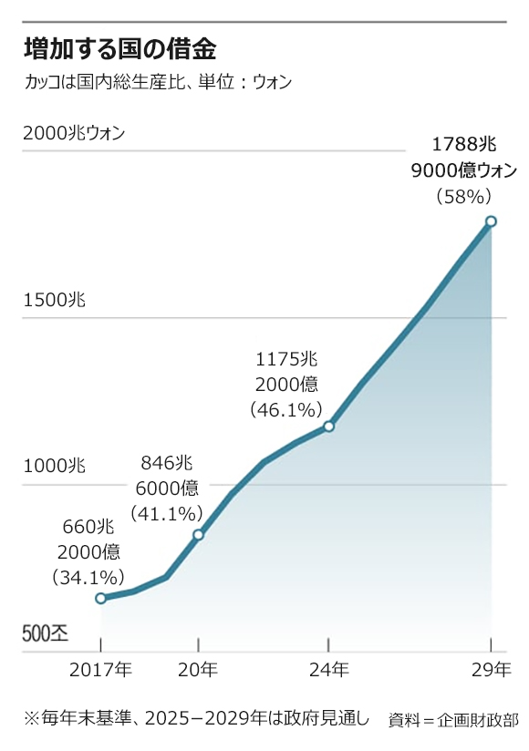 さらに深刻な問題は4%台の財政赤字は来年で終わるのではなく、現政権の任期中は継続することだ。政府は国の債務がここ4年で487兆ウォン(約51兆5000億円)も急増し、2029年末にはGDP(国内総生産)の58%に相当する1788兆9000億ウォン(約189兆3300億円)に膨れ上がると見込んでいる。その増加幅は年平均で121兆7500億ウォン(約12兆8900億円)と過去最高に達する見通しで、これは文在寅政権の年平均81兆4000億ウォン(約8兆6200億円)の1.5倍に相当する。