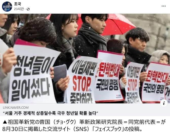 曺国院長は8月30日午前、フェイスブックに「ソウル居住で経済的に上層にいるほど極右青年である確率が高い」という記事をシェアした。この記事は▲目的を達成するための暴力使用の有無・規則違反を容認する姿勢▲福祉において個人にすべての責任を転嫁する認識▲対北朝鮮制裁重視▲中国の報復で経済に打撃を受けても韓米同盟を強化すべきだとする見解▲移民または難民に対する排他的な態度-という条件について、この五つ全てに合致すれば極右だと定義し、20代男性の15.7%、30代男性の16.0%、70歳以上の男性の10.0%が極右だとの調査結果が出たと主張している。