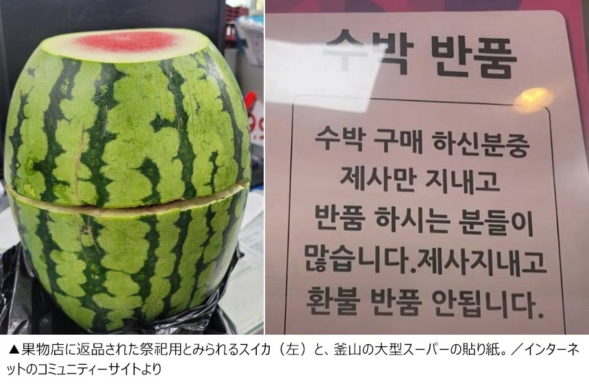 釜山市内の大型スーパーでは8月に入り「スイカを購入された方の中で、祭祀用に使ってそのまま返品される方が多くいらっしゃいます。祭祀用に使ったものの返品・返金には応じられません」という注意書きを貼り出した。