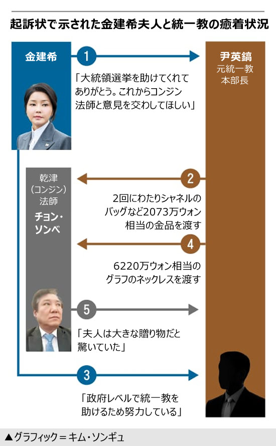 3日に特検が国会に提出した金夫人の起訴状によると、金夫人は尹・前大統領当選直後の2022年3月30日、チョン氏の要請を受けて尹英鎬(ユン・ヨンホ)氏=元統一教世界本部長=に電話をかけた。調べによると、金夫人は「チョン顧問が電話をするよう言っていた」とし「大統領選挙を助けてくれてありがとう。これからチョン顧問と意見を交わしてほしい」と言ったという。