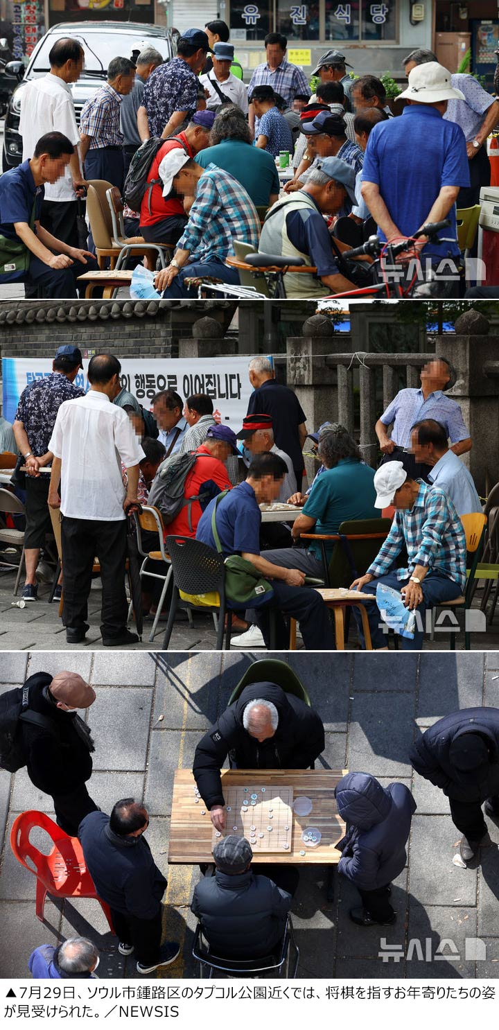 多くの高齢者たちが集まるソウル市鍾路区のタプコル公園から将棋盤が消えた。警察が7月末、「将棋禁止令」を下したためだ。タプコル公園は「お年寄りの聖地」と呼ばれている。毎日、1000人余りの高齢者でにぎわいを見せている。