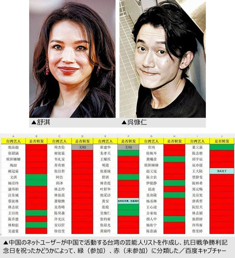 逆に中国では抗日戦争勝利80周年を祝わなかった台湾の芸能人に対する非難が殺到した。中国のウェブサイトでは、中国のネットユーザーが作成した台湾芸能人75人のリストが拡散した。CCTVのコンテンツをシェアしたかどうかを基準に緑(シェア)と赤(未シェア)に分類したリストだった。同投稿には「二股をかける日和見主義者が多すぎる」「祝賀投稿を行わないならば、中国で宣伝もするな」といった非難コメントが相次いだ。