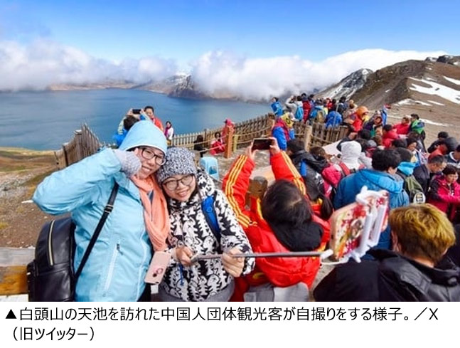 【写真】白頭山の天池で自撮りをする中国人団体観光客