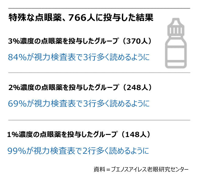 研究チームは、アルゼンチンの平均年齢55歳の患者766人を対象に、この特殊な目薬の効果をテストした。参加者は三つのグループに分けられ、1日2回、6時間間隔で濃度の異なる点眼薬を投与した。1%濃度の点眼薬を投与したグループ(148人)では、99%が視力検査表で2行以上多く読めるようになった。2%濃度の点眼薬を投与したグループ(248人)は、69%が3行以上多く読めるようになった。3%濃度の点眼薬を投与したグループ(370人)は、84%が3行以上多く読めた。研究チームは「従来の老眼治療法に代わる、安全で効果的かつ忍容性の高い新しい方法を発見した」と説明した。患者たちの視力は最長で2年間、改善された状態が続き、改善状態の平均持続期間は434日だったという。