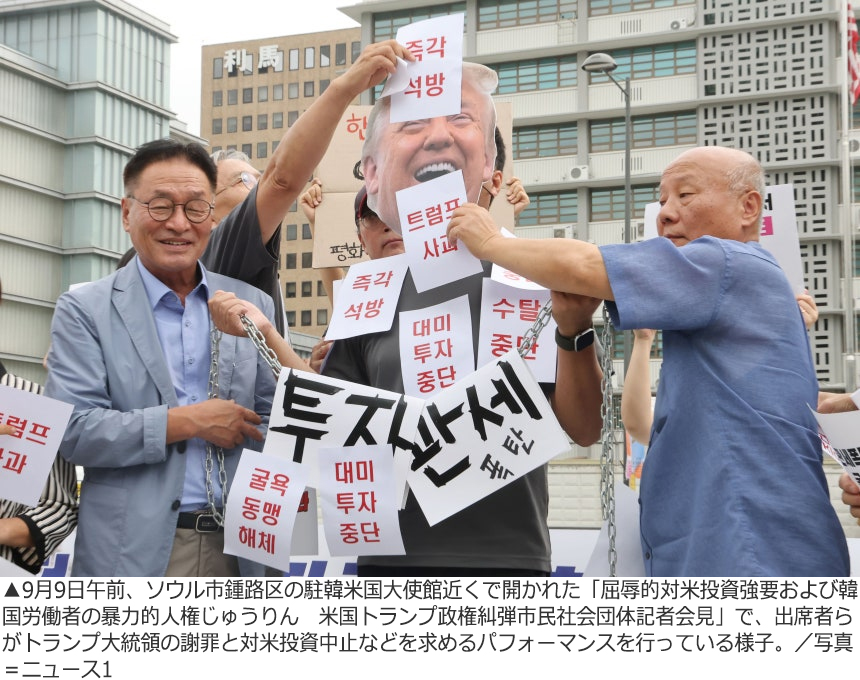 【写真】「屈辱的対米投資強要」 ソウルの米大使館前で対米投資中止を求める市民団体関係者たち