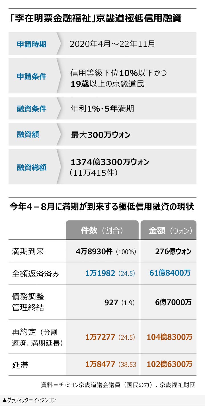 それから5年が過ぎ今年から満期が到来し始めているが、融資を受けた人のうち74%が満期後も返済に応じないため京畿道は頭を痛めている。今年4月から8月末までに満期が到来した極低信用融資4万8930件、額にして276億ウォン(約29億3000万円)のうち全額返済されたのはわずか24.5%(1万1982件)にとどまった。債務調整(1.6%)を受けたり、裁判所で破産が認められるなど管理終結(0.3%)となった融資を合わせても26%だ。
