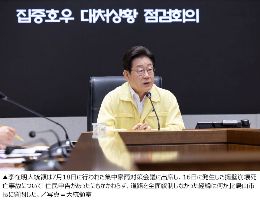 【写真】「住民から申告あったのになぜ通行止めにしなかったのか?」 烏山市長に質問する李在明大統領
