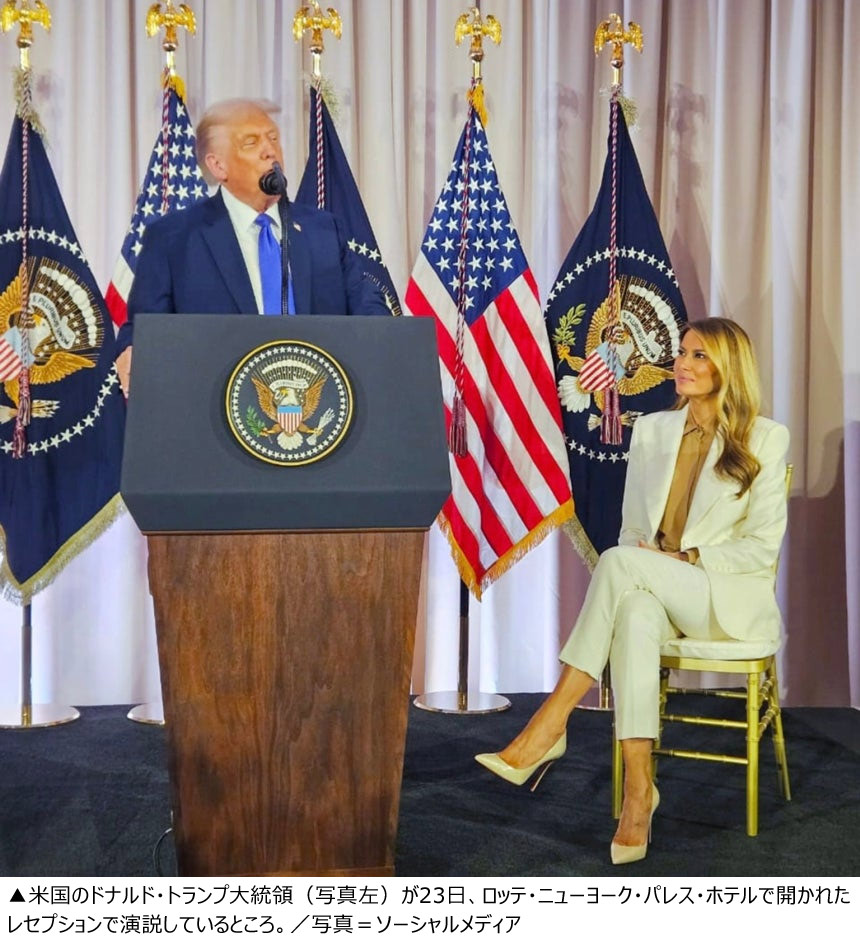 米国のドナルド・トランプ大統領が23日、ニューヨークで6年ぶりに国連総会演説を行った後、この期間に米国を訪れた各国首脳や配偶者のためにマジソン・アベニューの由緒ある「ロッテ・ニューヨーク・パレス・ホテル」で歓迎夕食会を主催した。ホワイトハウスのプール(代表取材)記者団によると、トランプ大統領は23日午後7時21分に到着してから午後8時49分にホテルを離れるまで、およそ1時間半滞在して各国首脳と対話した。会場はトランプ大統領の目に留まろうとする人々でいっぱいだったが、ホワイトハウス関係者は「145人の世界の首脳および配偶者が大統領夫妻と写真を撮るために列を作り、一部は何時間も待っていた」とコメントした。ただし、韓国の李在明(イ・ジェミョン)大統領は出席しなかったという。