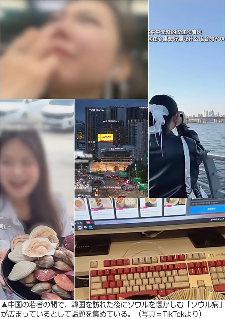 中国のSNS(交流サイト)には最近、ソウル旅行の感想などを共有し「ソウル病」を訴える投稿や動画が続々とアップされている。中国版TikTok「抖音(ドウイン)」に投稿された「ソウル病がひどくなった」と題する動画には、数十万件の「いいね」が付き、「道に迷ったとき、近くにいた韓国人のおばさまが助けてくれた..