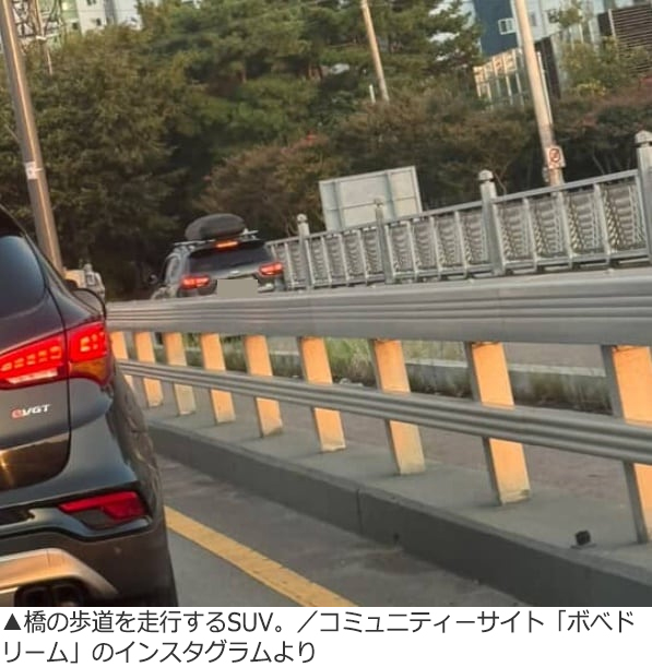 この件を巡っては、インターネットのコミュニティーサイトにも投稿があった。投稿者は、車道ではなく歩道を走行しているSUVの写真と共に「帰宅ラッシュの時間なので車がひどく渋滞しているのは分かるけど、こんなふうに歩行者が通る歩道を車で走る非常識な人がいる」「前に人がいるのに、お構いなしで走り続けていた」と書き込んだ。
