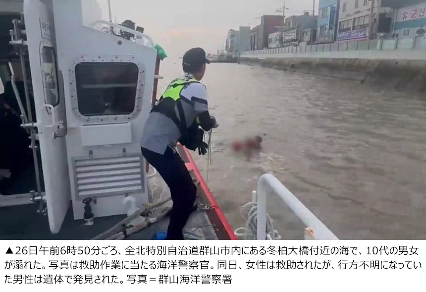 同署によると、Aさんは26日午前6時50分ごろ、冬柏大橋付近で友人のBさん(10代)が海に落ちたため、同署に通報して海に飛び込んだという。Bさんは通報を受けて出動した海洋警察官に救助されたが、Aさんは行方不明になった。
