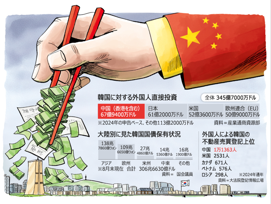 最近中国が韓国国債の保有額を急速に増やし、直接投資と株式・不動産投資も膨らんでいる。「チャイナマネーの襲来」は韓国の国内投資を活性化するプラスの側面がある一方、金融業界は韓国経済がチャイナマネーに左右されかねないリスクも高まっていると指摘する。