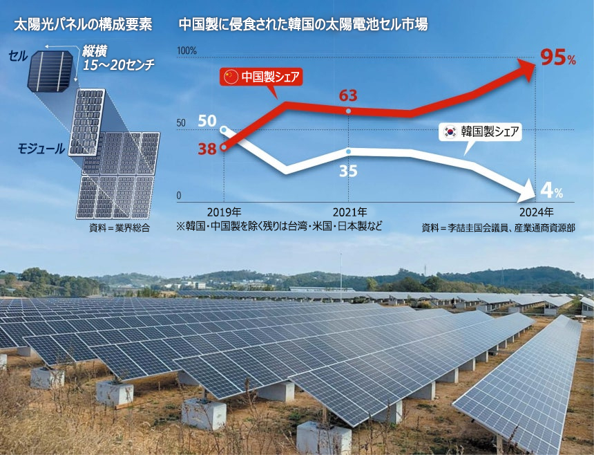 産業通商資源部が李喆圭(イ・チョルギュ)国会議員(国民の力)に提出した資料によると、中国製太陽電池セルの韓国におけるシェアは2019年の38%から21年に63%、23年に74%と年々上昇。昨年は95%に達した。一方、韓国製のシェアは19年の50%から21年に35%、23年に25%に落ち込み、昨年はさらに4.9%まで急落した。韓国製のシェアが1桁に転落したのは初めてだ。韓国の太陽電池市場に一部食い込んでいた台湾、米国、日本、シンガポール製シェアは、19年時点で11%だったが、昨年は0%となり、市場から姿を消した。中国製の太陽電池セルが韓国市場を完全に掌握した格好だ。