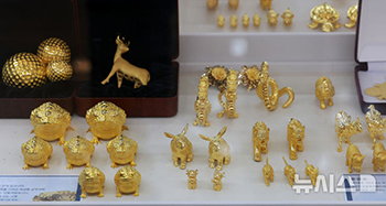 【NEWSIS】金価格が連日上昇の勢いを示している10日午前、ソウル市鍾路区の韓国金取引所に陳列されている金製品の様子。