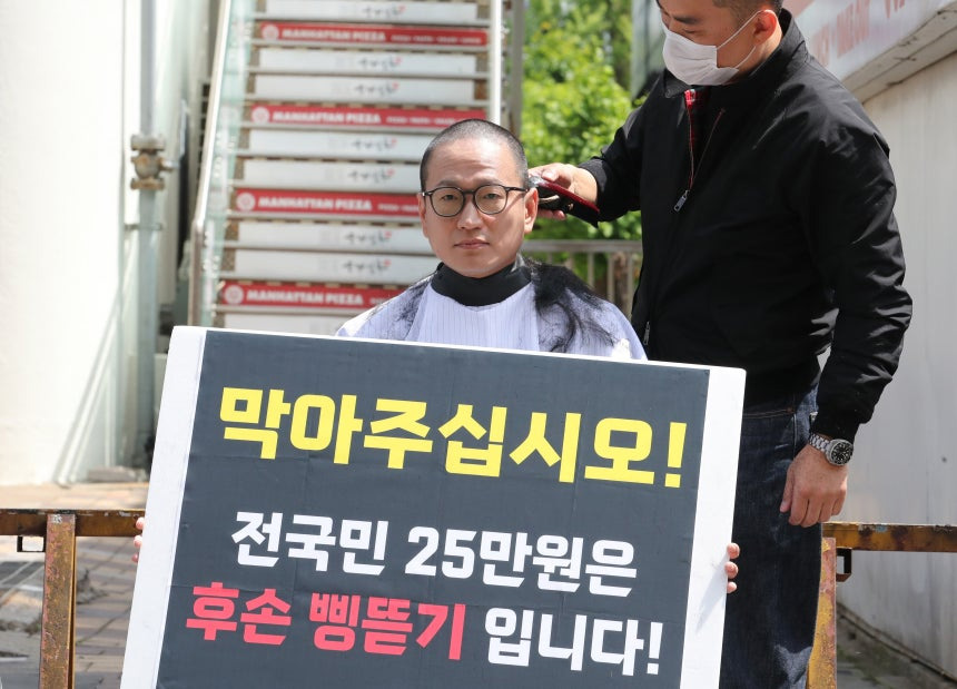▲昨年5月、ソウル・汝矣島の韓国野党・国民の力党本部前で、ユーチューバー兼お笑いタレントのキム・ヨンミン氏が、与党・共に民主党などで推進していた「全国民25万ウォン(約2万7000円)支援金」に反対し、「1人デモ」をする様子。写真=ナム・ガンホ記者