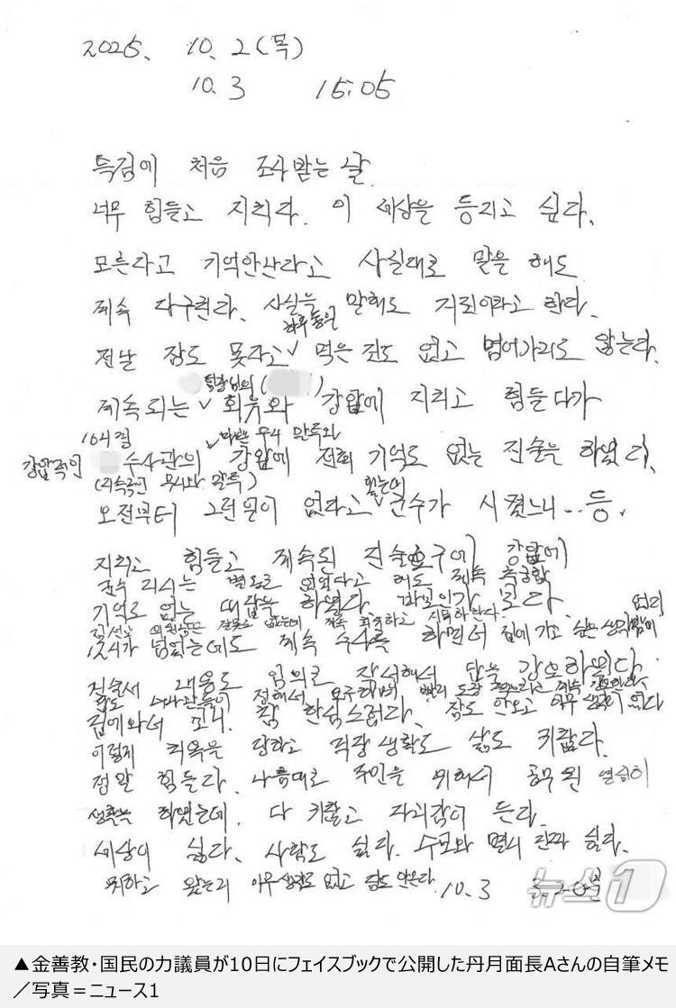 Aさんは今月2日午前10時に被疑者の身分で金建希特検に出頭した。特検による最初の取り調べだった。Aさんは夜間も取り調べを受け、3日午前1時15分に帰宅し、午前3時20分ごろに自宅で、当時のつらい心境をつづった自筆メモを作成した。このメモは保守系野党「国民の力」の張東赫(チャン・ドンヒョク)代表が10日に国会で公開した。