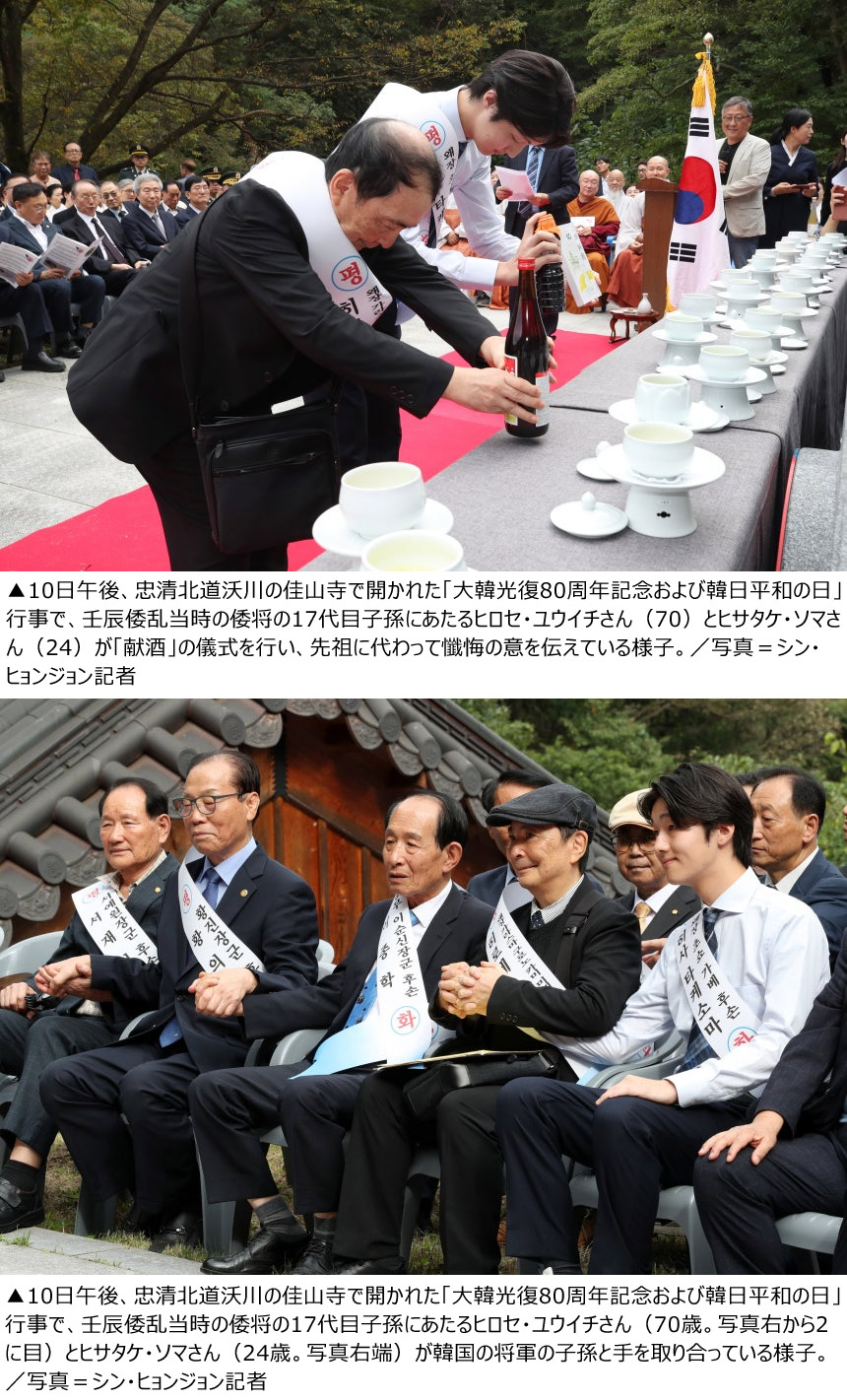 この日の行事には、日本人のヒサタケ・ソウマさん(24)とヒロセ・ユウイチさん(70)が出席し、義兵・僧兵を追悼する慰霊塔に酒杯をささげ、先祖の朝鮮侵略について謝罪した。