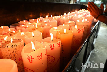 【NEWSIS】2026年度大学修学能力試験(修能。大学入学共通テストに相当。今年は11月13日スタート)まであと1カ月となった13日、京畿道華城市の竜珠寺で、受験生の保護者が子どもの修能高得点を願ってろうそくの前で祈りを捧げている様子。